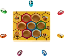 Joc educațional Fagure de albine Montessori sprijină dezvoltarea abilităților motorii și a independenței copiilor. Conține o bază din lemn masiv și șapte albine colorate, pe care copiii le așază în găuri corespunzătoare folosind penseta roșie din plastic.