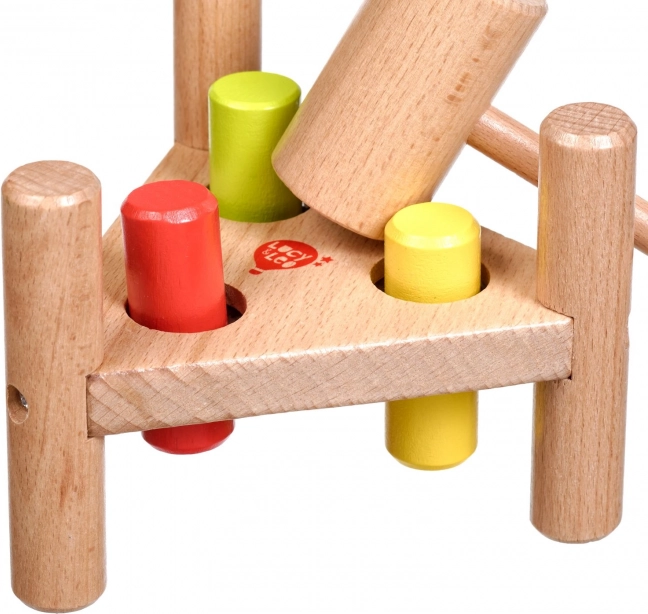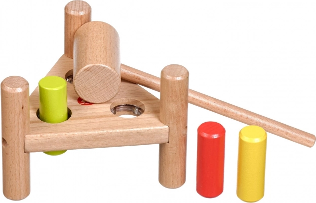 Baterea țărușilor colorați cu ciocănelul consolidează motricitatea fină, precizia prinderii și coordonarea mână–ochi la cei mici.