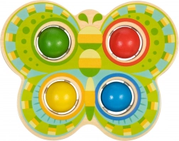 Un fluture colorat cu orificii pentru patru bile (verde, roșu, galben, albastru) ajută la recunoașterea culorilor și menține atenția.