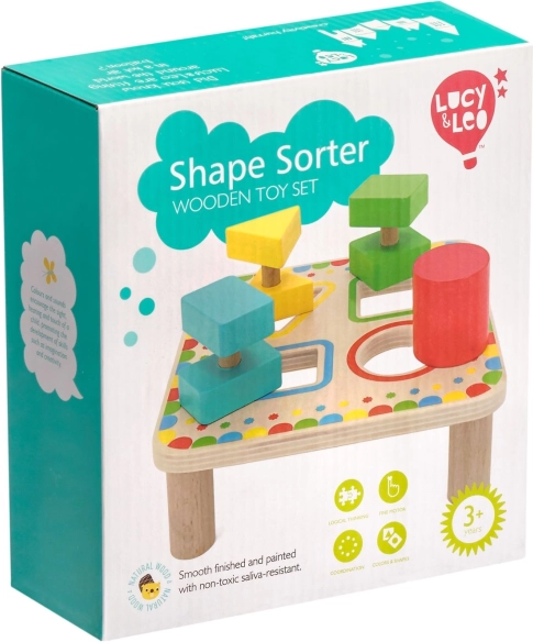 Placa, sprijinită pe picioare stabile, are patru orificii încadrate colorat, asortate cu culorile pieselor. Setul este ideal pentru jocul independent sau pentru descoperirea împreună cu părinții și este o excelentă jucărie educativă din lemn pentru preșcolari.