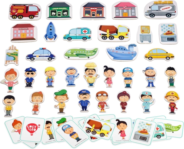 Setul bogat de piese magnetice și carduri față-verso îi motivează pe copii atât la potrivirea corectă, cât și la creație liberă în timp ce descoperă diferite profesii.