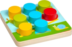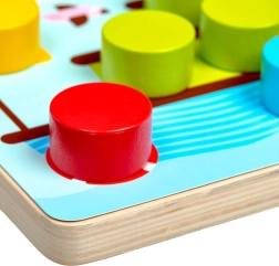 Pinii mari din lemn sunt ușor de prins și introdus în orificii, susținând coordonarea mână–ochi și învățarea culorilor prin joacă naturală.