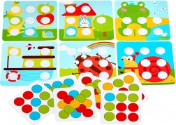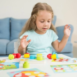 Conține imagini perforate și șabloane colorate pentru aranjare pe placă – copiii pot crea după model sau după propria imaginație.