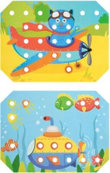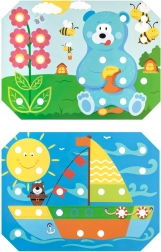 Patru șireturi colorate și carduri perforate dezvoltă concentrarea, perseverența și creativitatea în crearea propriilor modele.