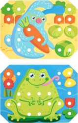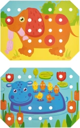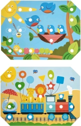 Copiii aleg unul dintre șabloanele colorate, îl așază pe suportul din lemn și umplu imaginea cu pini folosind penseta sau mâinile. Pot exersa și înșiretarea și brodarea cu ajutorul șireturilor incluse. Jocul susține în mod natural concentrarea, logica, răbdarea și precizia.