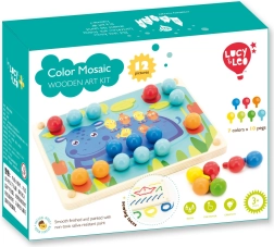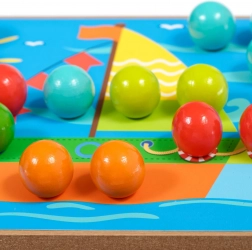 Suportul din lemn cu orificii, pinii colorați și penseta îi motivează pe copii la prindere precisă și antrenează motricitatea fină și coordonarea mână–ochi.