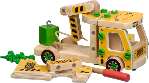 Pachetul include 16 piese din lemn pentru asamblarea macaralei, șuruburi, o șurubelniță și 4 blocuri colorate care reprezintă încărcătura. Această jucărie funcționează, de asemenea, ca un material Montessori, care ajută copilul să își dezvolte eficient abilități variate.