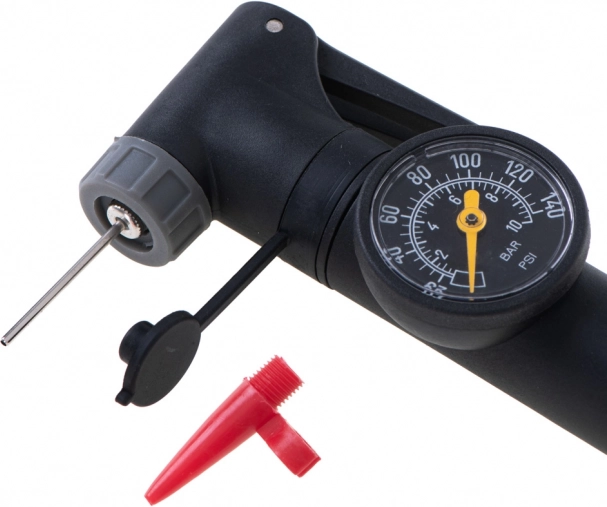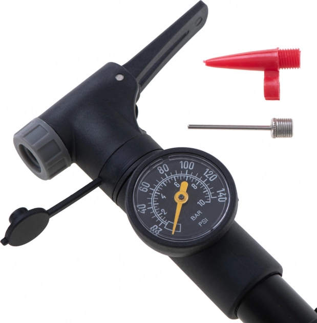 Este echipată cu mai multe accesorii pentru diferite tipuri de valve, inclusiv valve pentru mingi sportive sau accesorii de piscină. Datorită manometrului precis puteți verifica imediat presiunea corectă conform nevoilor dumneavoastră.