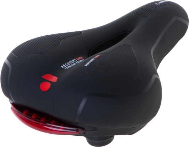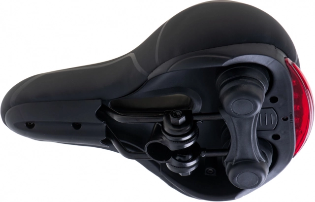 Forma mai lată este ideală pentru o poziție mai dreaptă, tipică bicicletelor de oraș, trekking și ciclism recreativ. Lumina LED spate integrată, cu 5 diode, îți crește vizibilitatea la amurg și după lăsarea serii; alimentarea cu CR2032 este inclusă în pachet.