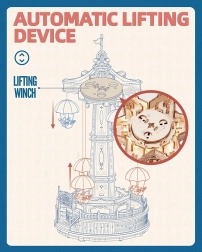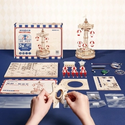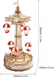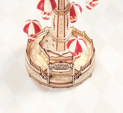 Acest puzzle 3D din lemn, elaborat cu atenție, este inspirat de clasicul turn cu parașuta din parcul de distracții. Baza hexagonală și ferestrele laterale translucide lasă să treacă o lumină caldă ce subliniază atmosfera unică. Caruselul este pus în mișcare de un motor pe baterii și iluminat cu LED-uri, iar controlul tactil permite gestionarea separată a mișcării și a sunetului.