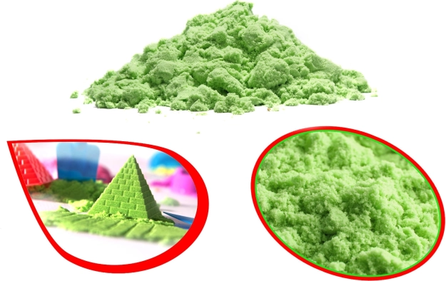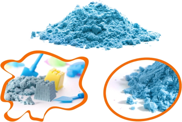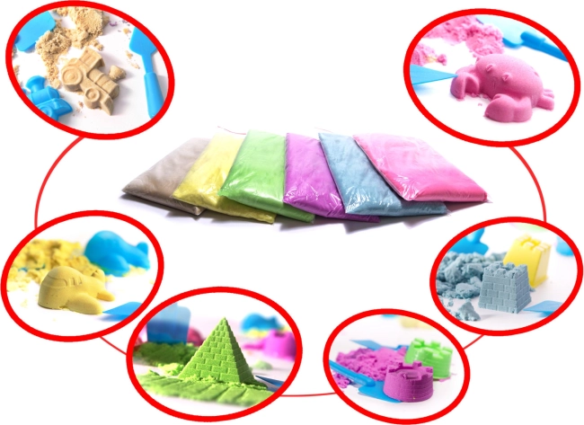 Materialul plastic nu se împrăștie și consistența sa amintește de un material excepțional de plăcut și relaxant la atingere. Nisipul nu își pierde proprietățile plastice după joacă, astfel încât copilul se poate juca cu el la nesfârșit.