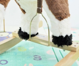 Căluțul include șa cu scărițe și zăbală, permițând copiilor să se apropie de senzația echitației reale.