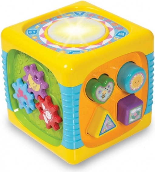 Fiecare latură oferă o altă activitate: pian cu tonuri și melodii, tobă care își schimbă culorile la lovire, sortator de forme cu piese mari, roți dințate colorate, animăluțe glisante și oglindă pentru descoperirea propriei reflecții. Cubul este fabricat din materiale de calitate, sigure, și este potrivit de la 8 luni.