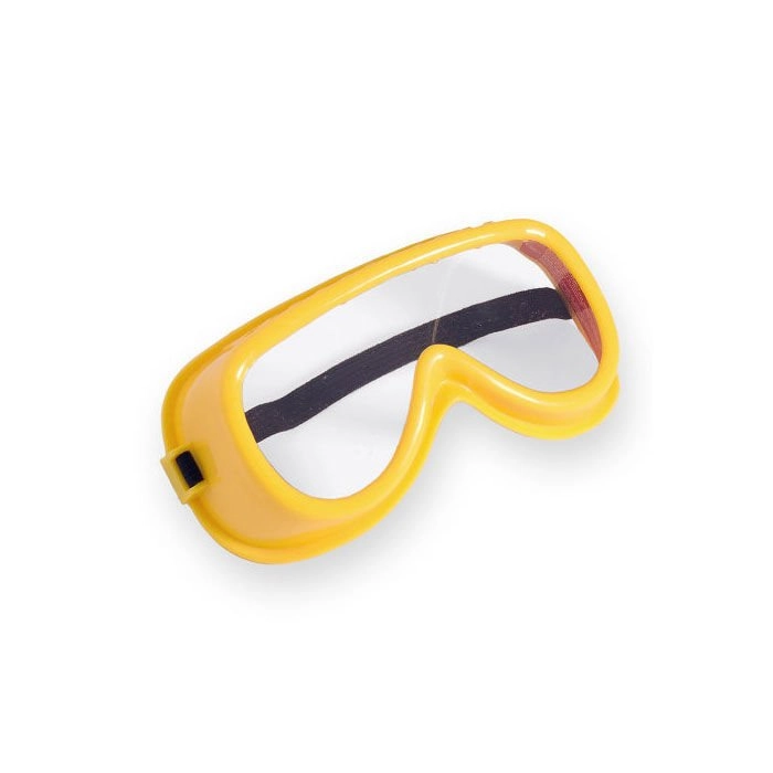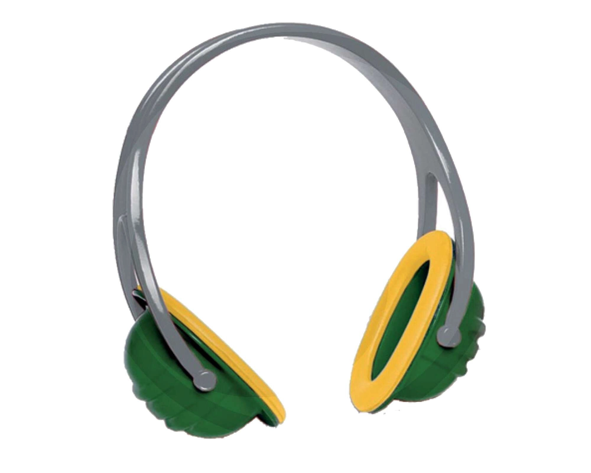 Ochelari galbeni cu lentile transparente din plastic și bandă elastică sunt completați de căști antifonice ușoare în combinație verde-galben pentru o experiență și mai realistă.