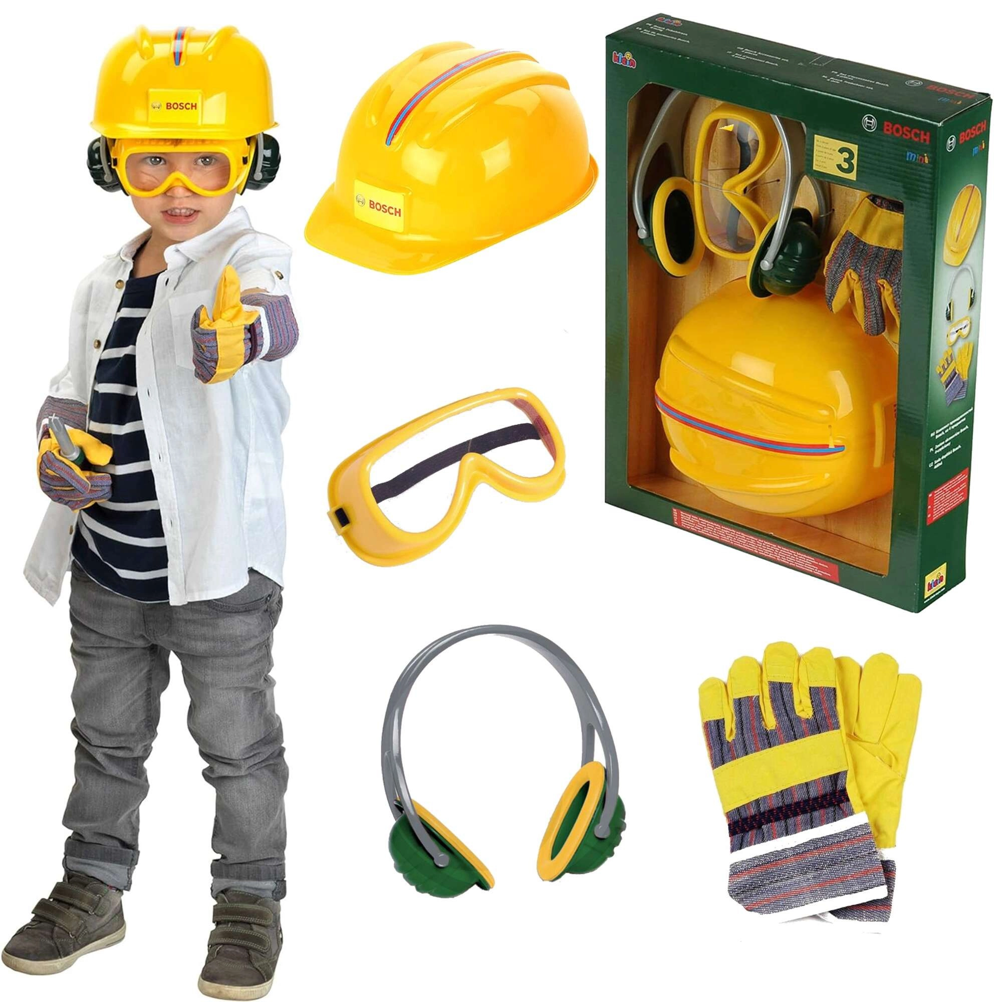 Set distractiv și sigur pentru micii constructori de la brandul Klein, licențiat BOSCH mini, include o cască de protecție pentru copii, ochelari, căști antifonice și mănuși. Perfect pentru joaca de-a reparatorul, dezvoltarea imaginației și jocul de rol, cu accent pe „siguranța la lucru” în viziune pentru copii.