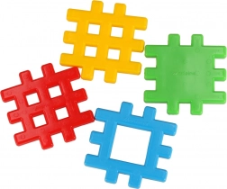 Piese de aproximativ 10,5 × 10,5 cm cu îmbinare tip grilaj, confortabile la mânuit și sigure la conectare – perfecte pentru mâini mici de la 2 ani.