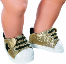 Fă fiecare pas al păpușii să strălucească cu adidașii la modă BABY BORN în nuanță aurie. Suprafața lucioasă cu glitter, detaliile contrastante și talpa moale asigură confort chiar și în timpul aventurilor de joacă prelungite. Un accesoriu grozav pentru toate micile stiliste care vor să ofere păpușilor lor stil, sclipire și originalitate.