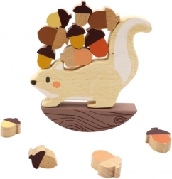 Veverița jucăușă se pregătește de iarnă – va putea căra toate ghindele? Alternați mutările cu adversarul și așezați piesele astfel încât veverița, pe baza ei instabilă, să nu se răstoarne. Reguli simple și suspans la fiecare tură fac din acest joc de echilibru din lemn o alegere excelentă pentru copiii de la 3 ani.