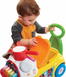 Pe panoul frontal găsești o claviatură cu două moduri: redarea a 5 melodii vesele de marș și joc liber pentru primele experimente muzicale. Practicul spațiu de depozitare sub șezut găzduiește mărunțișurile pe care micii șoferi vor să le aibă mereu la îndemână.