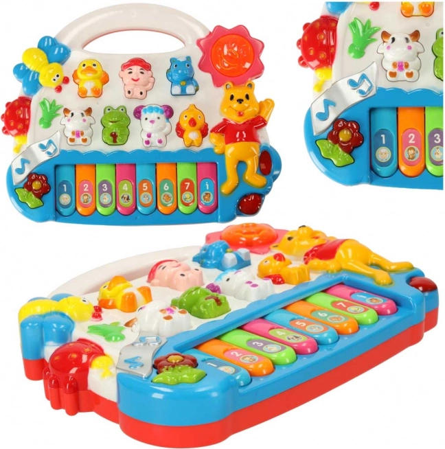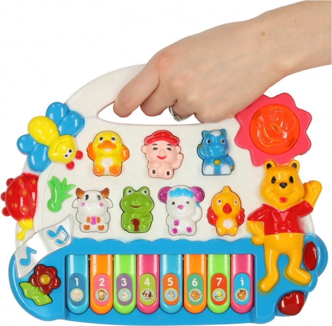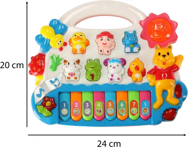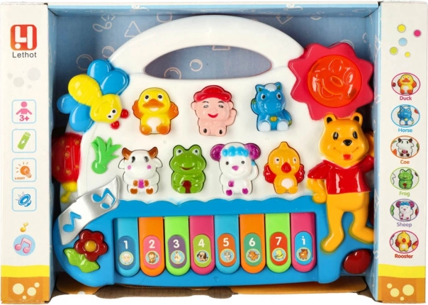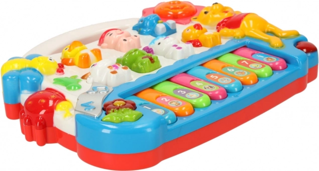 Acest pian drăgălaș cu animăluțe vesele îi va captiva pe copii din primele momente. În funcție de modul ales, redă gama, melodii sau sunete de animale. La apăsarea clapelor se aprinde soarele, ceea ce îi motivează pe copii la mai multă interacțiune și explorare.