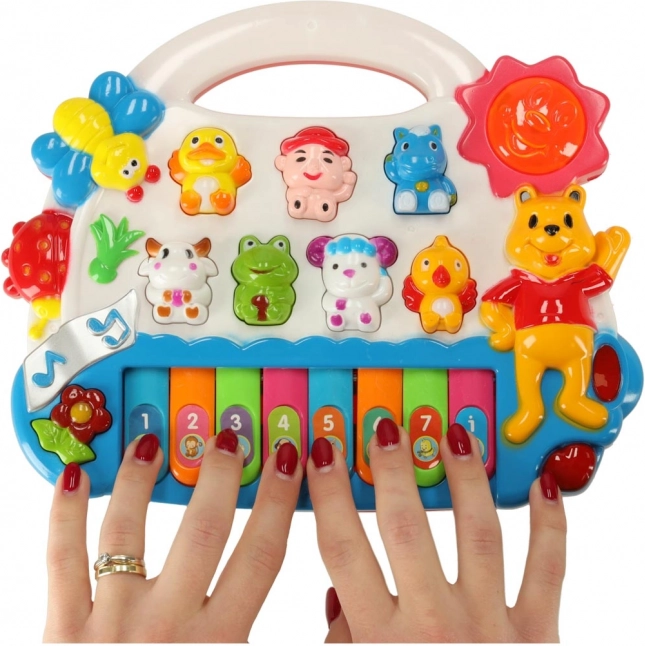 Pianul interactiv colorat pentru cei mici oferă melodii, gamă și sunete de animale, care dezvoltă auzul și imaginația. Datorită efectelor luminoase la apăsarea clapelor și mânerului practic, este grozav atât acasă, cât și în călătorii. Jucăria susține dezvoltarea cognitivă și învățarea culorilor și numerelor – învățare și distracție într-unul.