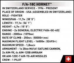 Acest model este un cadou excelent pentru fanii aviației și tehnologiei militare de toate vârstele. Datorită designului licențiat, se potrivește perfect atât în camera unui adolescent, cât și în birouri reprezentative. Modelul F/A-18C Hornet înlocuiește avioanele franceze Mirage IIIS în forțele aeriene elvețiene din 1992, când au fost comandate 34 de avioane în diferite versiuni.