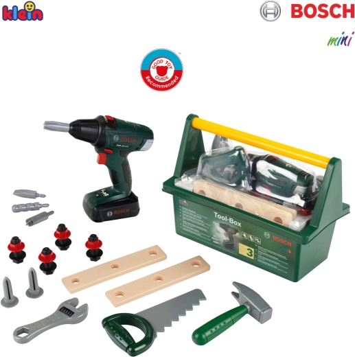 Acest set de calitate pentru copii este realizat sub licența BOSCH și este conceput pentru a imita fidel uneltele reale, fiind în același timp complet sigur pentru copii. Cutia robustă pentru unelte, de culoare verde închis, cu mâner galben confortabil păstrează toate piesele laolaltă și ușurează transportul.