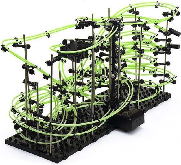 După asamblare, urmărește cum bilele metalice se avântă în jos și se întorc cu liftul elicoidal înapoi la start. În întuneric pista strălucește, astfel încât fiecare trecere arată impresionant. Arată familiei și prietenilor principiile fizice de bază în acțiune – viteza, gravitația și forța centrifugă.