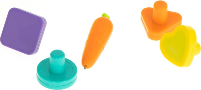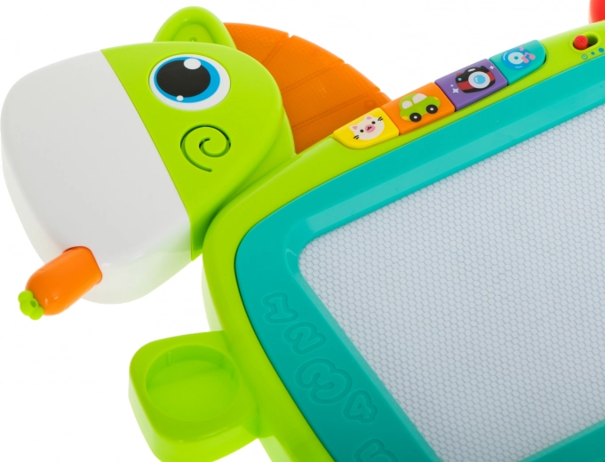 Elementele interactive aduc sunete de animale, sunete de mijloace de transport, sunete din gospodărie și melodii vesele. Jucăria are 2 niveluri de volum și posibilitatea de a opri sunetul complet. Stiloul în formă de morcov, introdus în „gurița” căluțului, produce un efect de trosnit. Marginile tablei sunt decorate cu litere și cifre reliefate – ideale pentru primul contact cu formele.