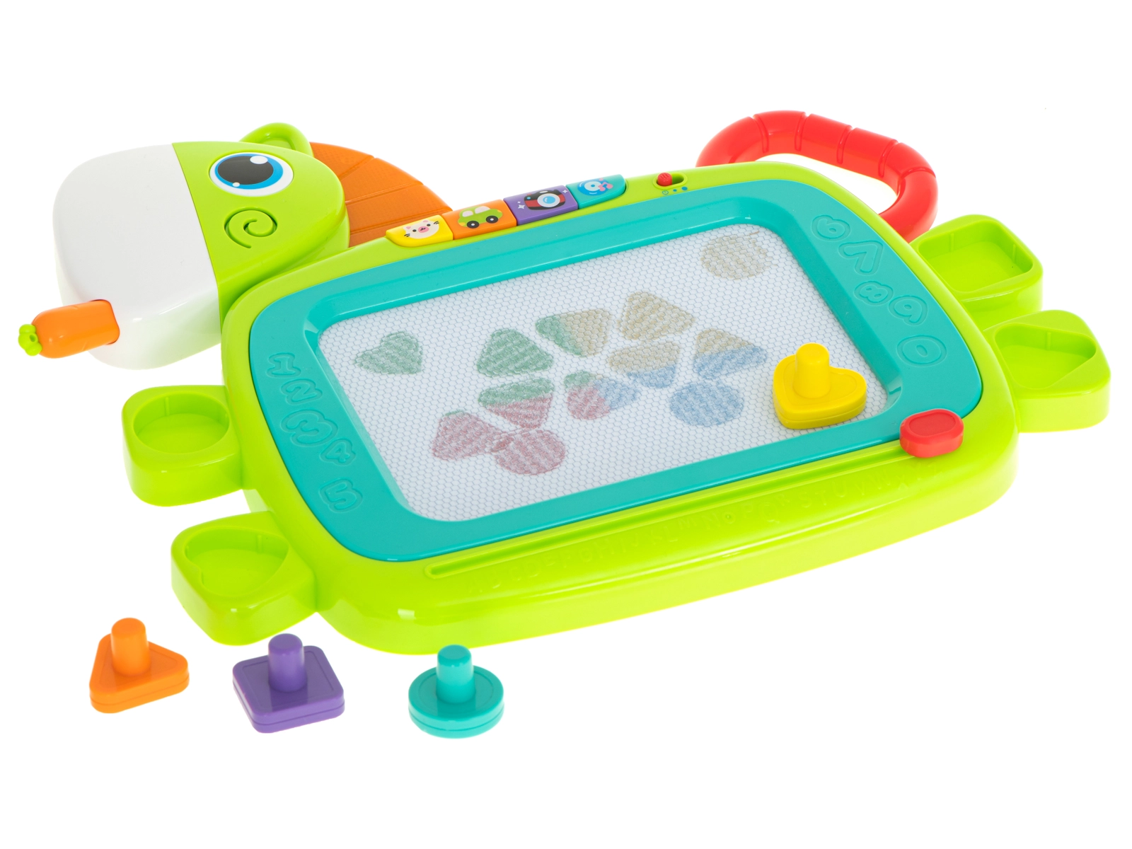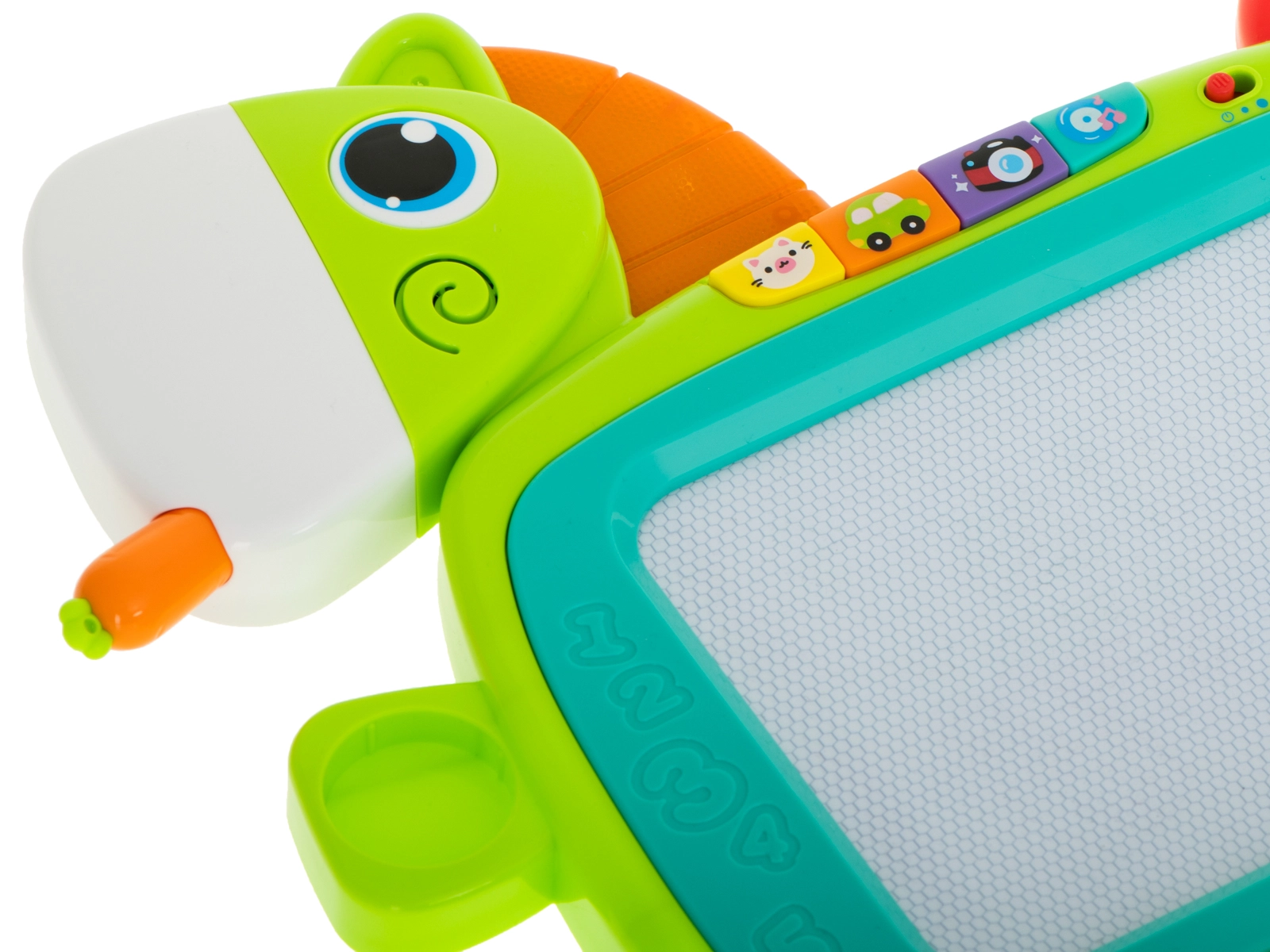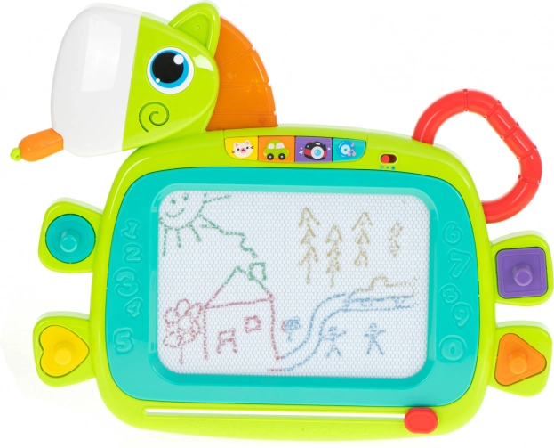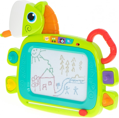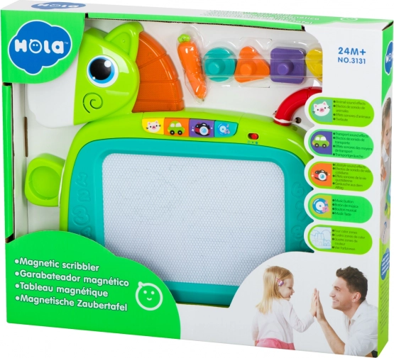 Tabla magnetică HOLA este o alegere excelentă pentru dezvoltarea creativității și a motricității fine. Datorită celor patru zone colorate, desenele apar în culori care îi încântă pe copii. Cu o singură mișcare a glisorului, suprafața se șterge și este gata pentru idei noi. Forma de căluț cu coamă luminoasă și sunete vesele îi motivează pe copii la joacă.