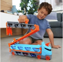 Transformă camionul în câteva clipe într-o pistă de curse completă. Transportorul ascunde până la 20 de mașinuțe în spatele ferestrelor transparente, astfel încât ai colecția mereu la vedere. Trăgând de mâner, semiremorca se desfășoară într-o pistă cu două benzi de 1,8 m, iar cabina devine o stație dublă de lansare pentru starturi corecte.