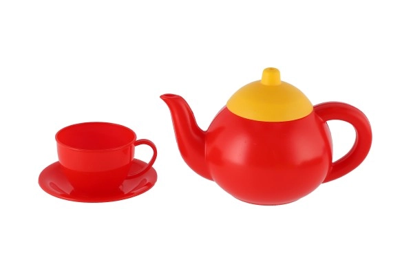Ceainic roșu și patru cești colorate cu farfuriuțe permit „prepararea” și servirea ceaiului pentru toată familia sau prieteni.