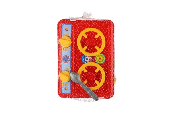 Aragaz roșu cu două plite și butoane rotative stimulează imaginația și îi învață pe copii bazele gătitului într-un mod sigur.