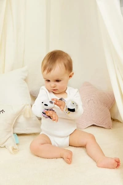 Zornăitoarea moale pentru încheietura mâinii de la GAGAGU dezvoltă auzul, văzul și motricitatea fină. Datorită culorilor contrastante și sunetului delicat al zornăitorii, captează atenția bebelușului, iar materialul pluşat plăcut, fără piese din plastic, este sigur și potrivit chiar și pentru cei mai mici. Poate fi prinsă pe mână cu scai sau folosită ca o zornăitoare clasică.