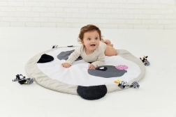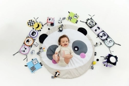 Descoperă covorașul senzorial moale și sigur pentru bebeluși cu motiv panda de la GAGAGU. Modelele contrastante alb-negru susțin dezvoltarea vizuală, texturile diferite de pe urechi și obrăjori dezvoltă simțul tactil, iar materialul foșnitor integrat stimulează auzul. Covorașul este fără piese din plastic, plăcut, moale și dens pentru confort termic, cu bucle practice pentru prinderea altor jucării.