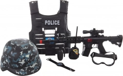 Echipament de poliție realist pentru deghizări și aventuri zilnice ale copiilor. Vesta neagră cu inscripția POLICE oferă un aspect autentic și buzunare practice, pușca cu efect de clic intensifică experiența de acțiune, iar casca cu model camuflaj completează ținuta.