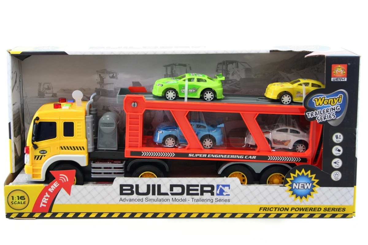 Descoperiți lumea dinamică a transportului rutier cu un camion redat în detaliu, care servește drept transportor pentru autoturisme. Modelul pe baterii, la apăsarea butoanelor, se aprinde și emite sunete, intensificând experiența de joc și stimulând imaginația copiilor.
