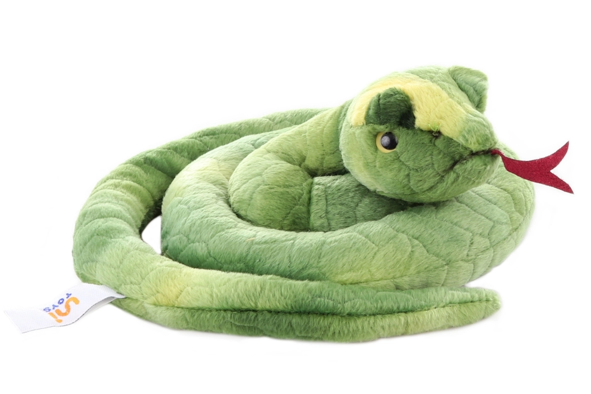 Acest șarpe de pluș verde oferă copiilor îmbrățișări delicate și multă fantezie. Este plăcut de moale, sigur pentru bebeluși și, datorită dimensiunilor sale, se ține confortabil în mână. Detaliile realiste, precum limbuța roșie despicată și textura fină de „solzi”, transformă jucăria într-un companion îndrăgit pentru pătuț și cărucior.