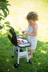 Prezentăm grătarul de jucărie pentru copii de la marca renumită Smoby, care aduce bucurie și distracție tuturor micilor iubitori de gătit. Acest grătar este echipat cu 18 accesorii autentice, printre care se numără hamburger, frigăruie, clește pentru grătar, aprinzător sonor și râșniță pentru sare și piper. Cu acest echipament, copiii pot experimenta senzatia reală de grătar.
