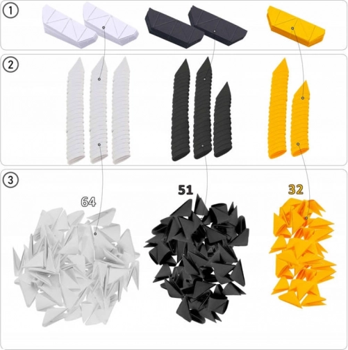 Ghidul ușor de înțeles și pașii vizuali te conduc prin fiecare pliere. Modulul de bază se realizează în trei pași, apoi doar construiești fără lipici.