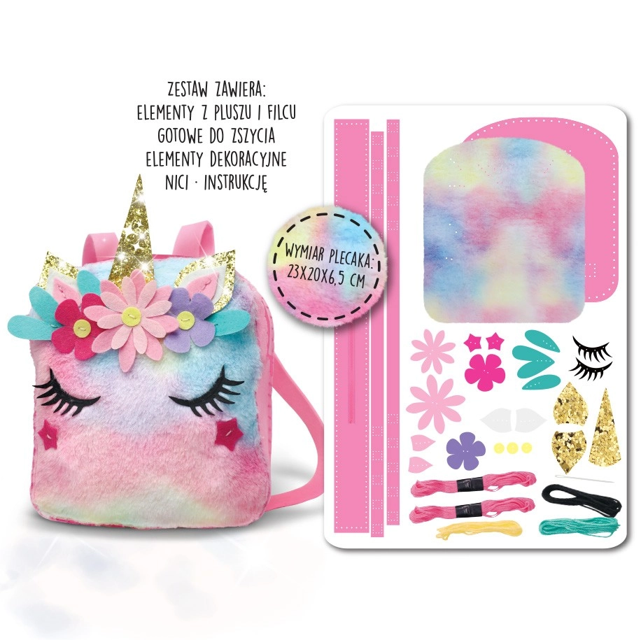 Setul pentru cusut – rucsac cu unicorn – este o idee ideală pentru activități recreative. Cu ajutorul acestui set, fiecare fată poate coase un rucsac cu dimensiunile aproximative de 23 cm x 20 cm x 6,5 cm, care va fi completarea perfectă a unei ținute la modă. Setul conține: elemente din fetru și pluș pregătite pentru cusut, elemente decorative, ață, ac de plastic, instrucțiuni.
