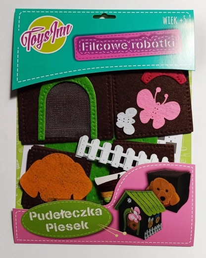 Set creativ pentru coaserea cutiuțelor din fetru cu cățel. Pachet complet, sigur pentru copii, coasere ușoară. Dimensiuni 12×15×12 și 8×8×8 cm.