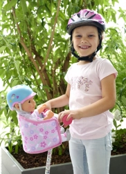 Oferiți-le copiilor un joc și mai realist în timpul plimbărilor în aer liber. Scăunelul textil de bicicletă pentru păpuși NEW BORN BABY, cu un model floral delicat, este conceput pentru transportul sigur și confortabil al păpușii pe ghidonul bicicletei sau trotinetei. Centura de siguranță integrată, cu închidere ușoară, menține păpușa bine fixată, în timp ce căptușeala moale o protejează de șocuri.