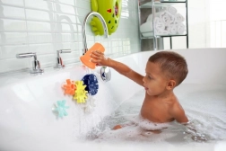 Transformați baia într-un mic laborator! Roțile dințate colorate cu ventuze se fixează ușor pe suprafața netedă a căzii sau pe faianță. Când lăsați apa să curgă peste ele, încep să se rotească și împreună creează un sistem interactiv cu apă, care îi motivează pe copii să descopere și să experimenteze.