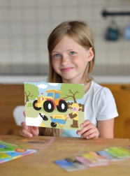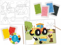 Acest set creativ din nisip este o alegere excelentă pentru micii creatori de la 6 ani. Este suficient să dezvăluiți treptat părțile motivului și să le presărați cu nisip colorat – culorile aderă pe suprafața autoadezivă și ia naștere o imagine clară și curată. Setul oferă două motive îndrăgite: tractor și mașină de pompieri.