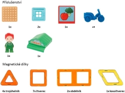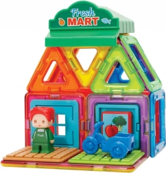 Cu setul de construcție Magformers Orașul Piața puteți construi diverse clădiri arhitecturale după propria imaginație. Conține 14 forme magnetice și 8 accesorii funcționale, inclusiv o mică vânzătoare, care permit crearea de secțiuni parțial descoperite, unde pe o parte se văd contururile exterioare ale clădirii, iar pe cealaltă soluțiile interioare.