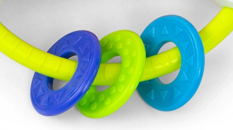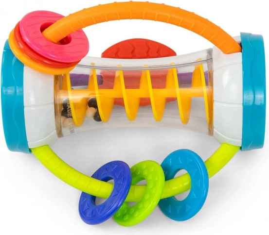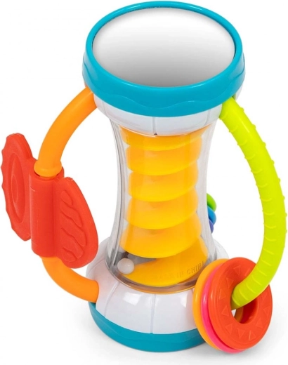 Fiecare părinte are sarcina de a alege jucăriile potrivite pentru dezvoltarea copilului său. Marca noastră Milly Mally, prin gama sa, susține tocmai acest tip de dezvoltare. Vă prezentăm zornăitoarea shaker, care stimulează curiozitatea copilului dumneavoastră. Este o zornăitoare și un inel de dentiție care îi stimulează simțurile, lucru esențial în primele etape ale dezvoltării copilului. Jucăria stimulează copilul, îi dezvoltă motricitatea fină, adică mișcările controlate și precise, inclusiv mimica, și îi dezvoltă sensibilitatea la sunete. În interiorul părții transparente cu spirală vizibilă se află biluțe colorate care, atunci când sunt puse în mișcare, emit un sunet plăcut de zornăit și trezesc entuziasmul copilului. Pe cele 3 mânere ale shakerului nostru am plasat 3 inele colorate cu texturi diferite și un inel de dentiție care îl învață pe copil să distingă culorile și formele. În același timp, copilul primește stimuli senzoriali și își dezvoltă simțul tactil. Cele trei mânere exersează prinderea și permit transferul obiectului dintr-o mână în alta. Inelul de dentiție plasat pe unul dintre ele, realizat din plastic plăcut la atingere, cu texturi diferite, susține erupția dinților. Oglinzile de la capetele exterioare ale shakerului reflectă lumina și creează efecte vizuale interesante, care ajută la dezvoltarea percepției vizuale și a capacității de a recunoaște propria reflexie. Se ține ușor în mânuțele mici.
