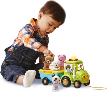 Tractorușul Voios este jucăria ideală pentru micii exploratori. Datorită animăluțelor colorate, care se introduc în orificiile potrivite de pe remorcă, copiii exersează recunoașterea formelor și culorilor și învață să denumească animăluțele și să numere. În timpul mersului, animăluțele se leagănă distractiv, stimulând curiozitatea copiilor și prelungind jocul.