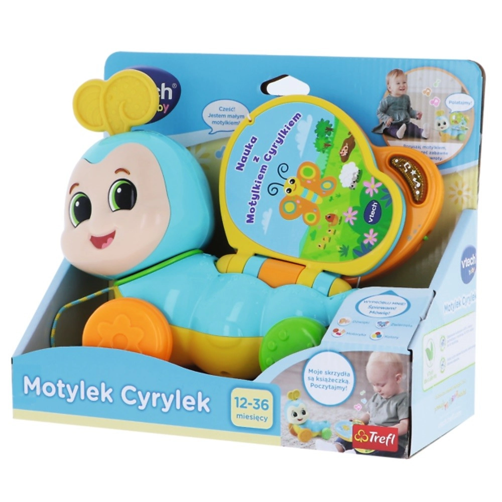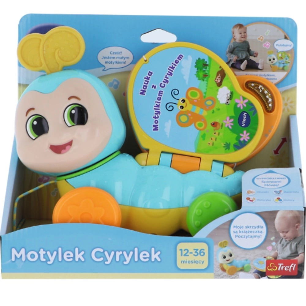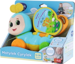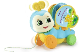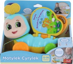 După ce tragi de șnur, fluturașul pornește și îi însoțește pe copii cu sunete și expresii vesele. Susține dorința naturală de a se târî și de a merge.