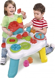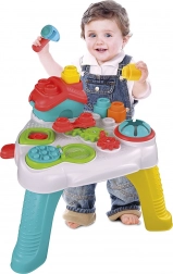Masa oferă o gamă largă de activități pentru dezvoltarea abilităților motrice ale copiilor, cum ar fi roți dințate, catapultă pentru cuburi și bule care pocnesc.